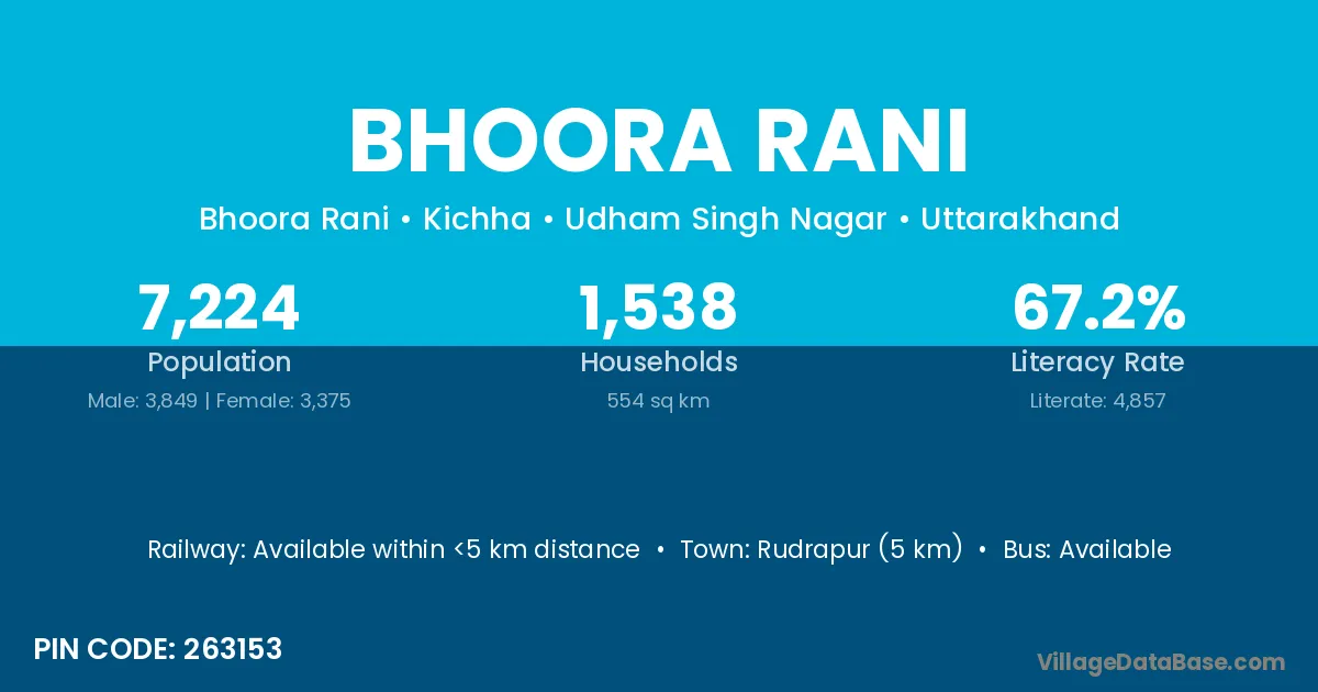 Rudrapur (5 km) is the nearest town to Bhoora Rani village for major economic activities and is located approximately 5 km away.