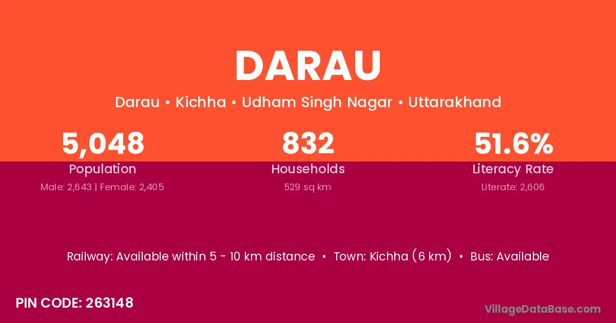 Kichha (6 km) is the nearest town to Darau village for major economic activities and is located approximately 6 km away.
