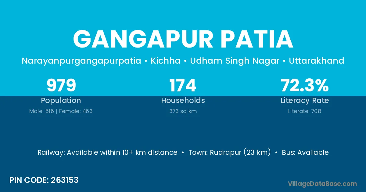 Rudrapur (23 km) is the nearest town to Gangapur Patia village for major economic activities and is located approximately 23 km away.