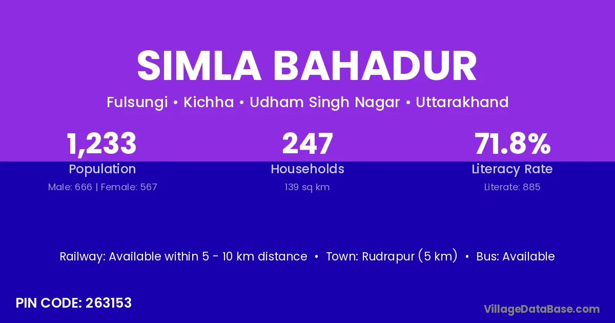 Rudrapur (5 km) is the nearest town to Simla Bahadur village for major economic activities and is located approximately 5 km away.