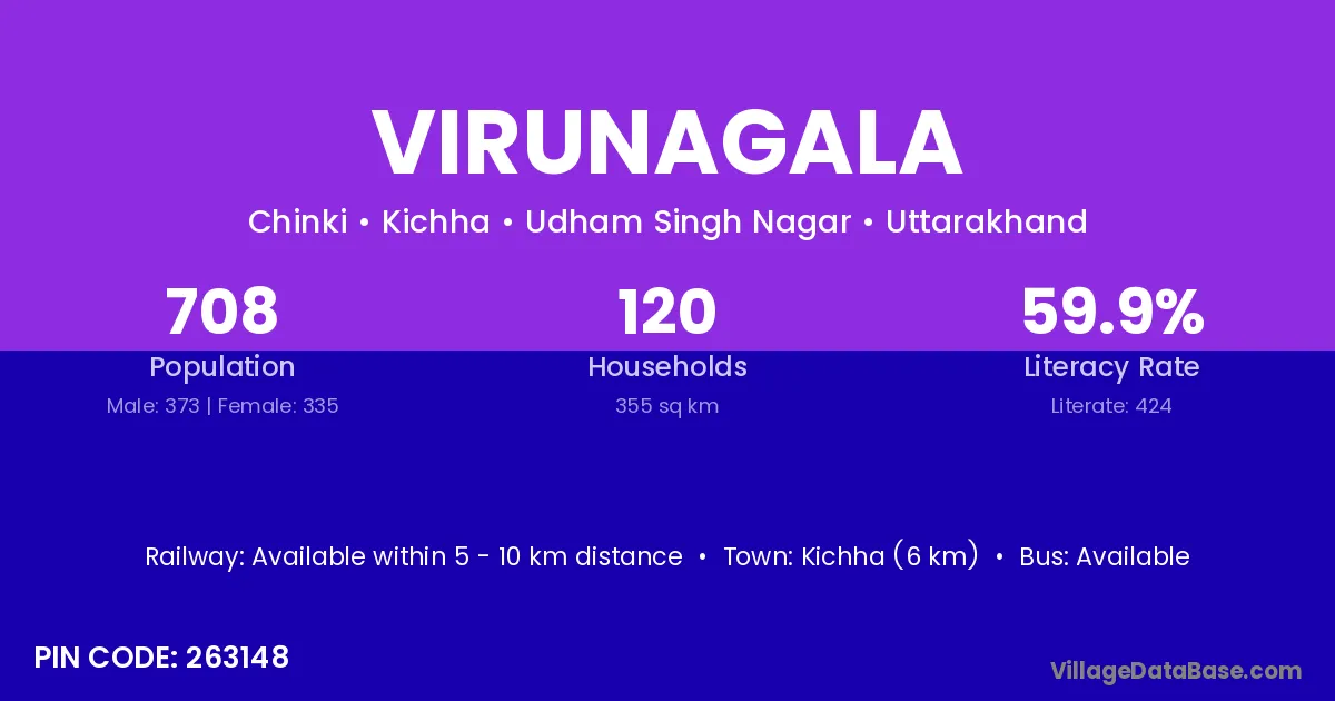 Kichha (6 km) is the nearest town to Virunagala village for major economic activities and is located approximately 6 km away.