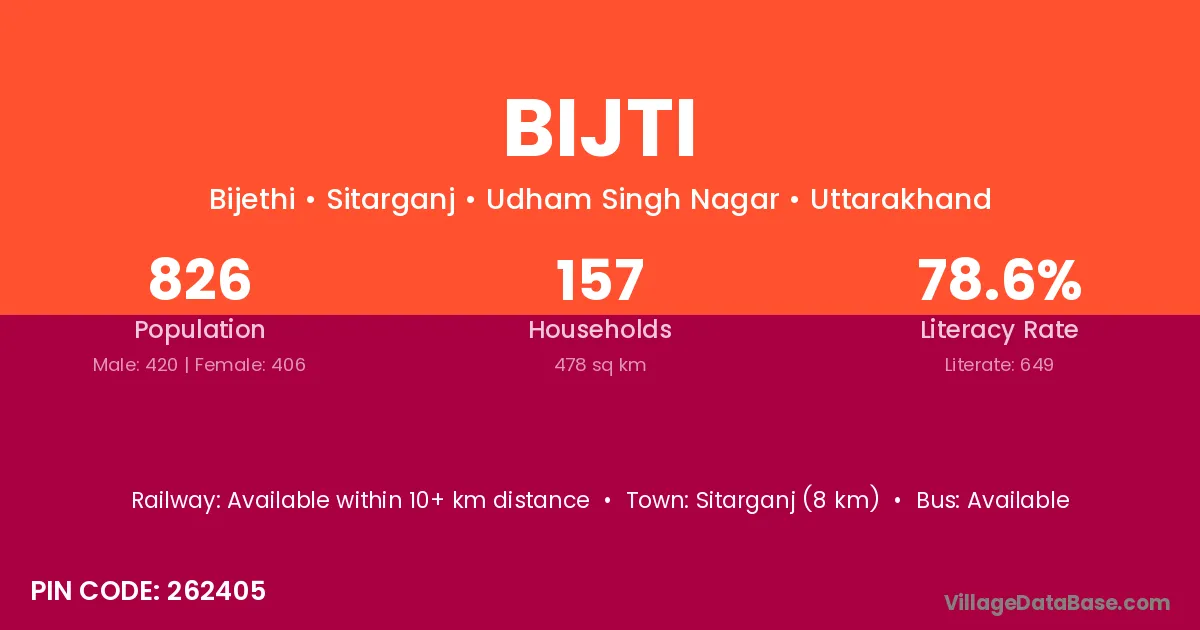 Sitarganj (8 km) is the nearest town to Bijti village for major economic activities and is located approximately 8 km away.