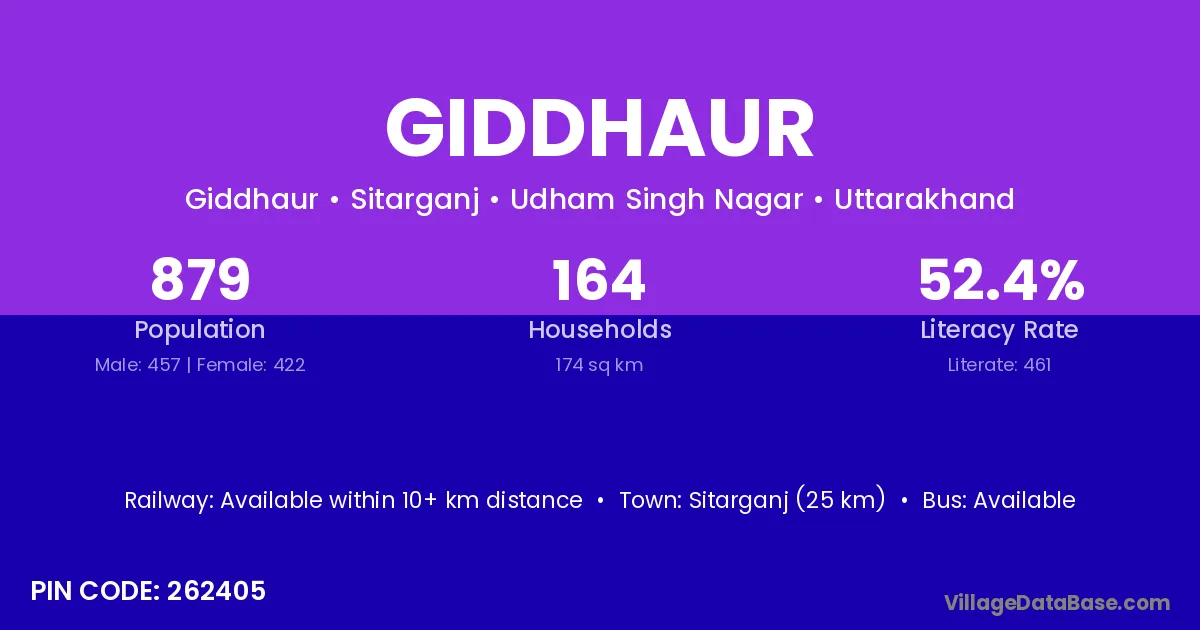 Sitarganj (25 km) is the nearest town to Giddhaur village for major economic activities and is located approximately 25 km away.