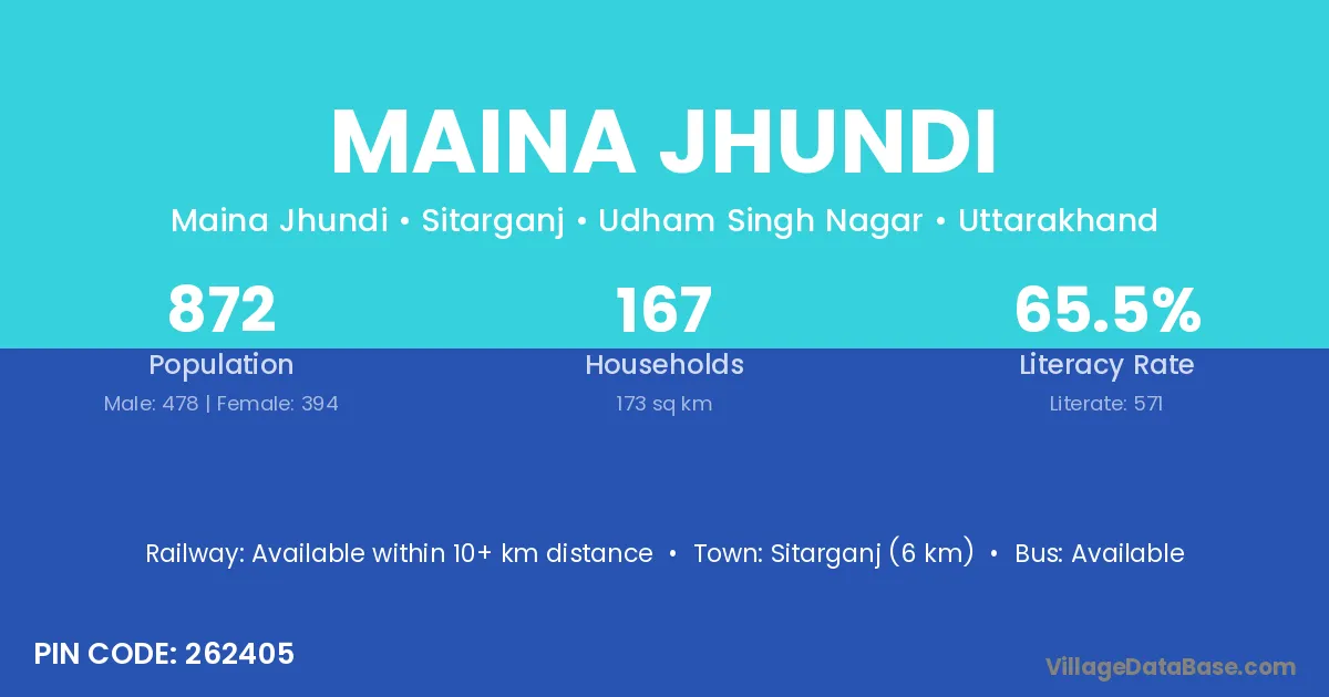 Sitarganj (6 km) is the nearest town to Maina Jhundi village for major economic activities and is located approximately 6 km away.