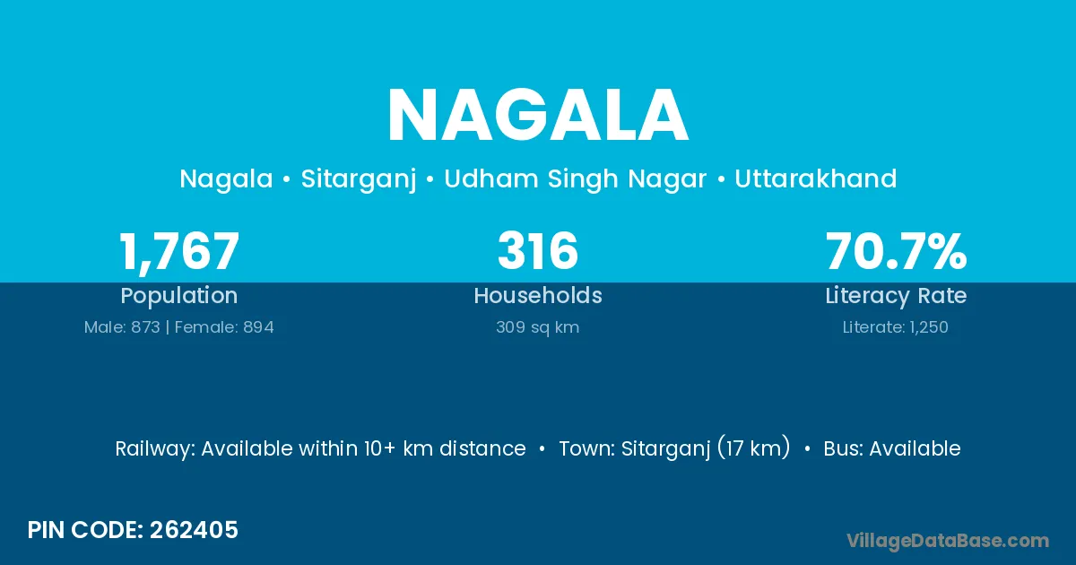 Sitarganj (17 km) is the nearest town to Nagala village for major economic activities and is located approximately 17 km away.