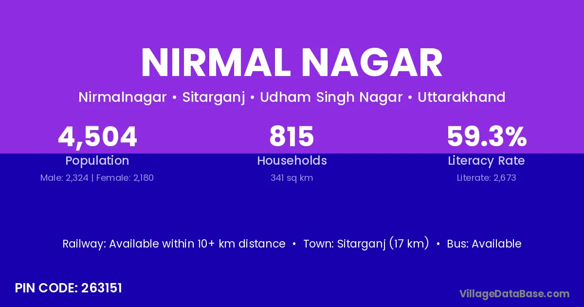 Sitarganj (17 km) is the nearest town to Nirmal Nagar village for major economic activities and is located approximately 17 km away.