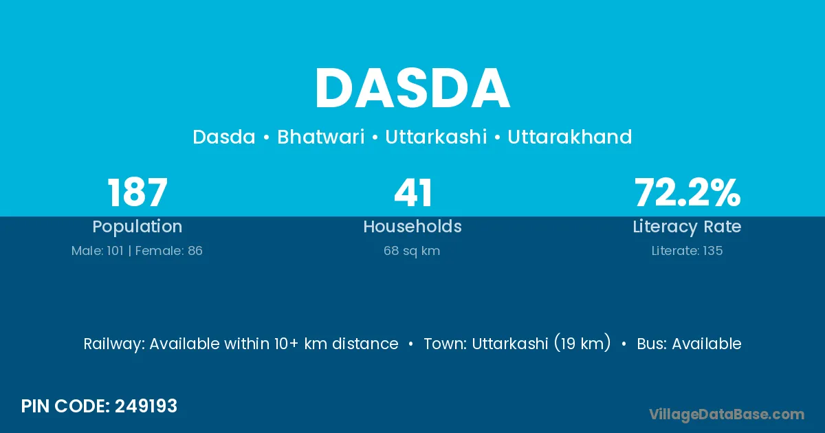 Uttarkashi (19 km) is the nearest town to Dasda village for major economic activities and is located approximately 19 km away.