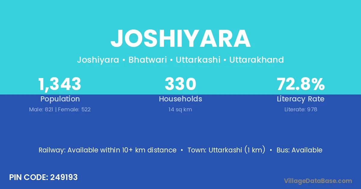 Uttarkashi (1 km) is the nearest town to Joshiyara village for major economic activities and is located approximately 1 km away.