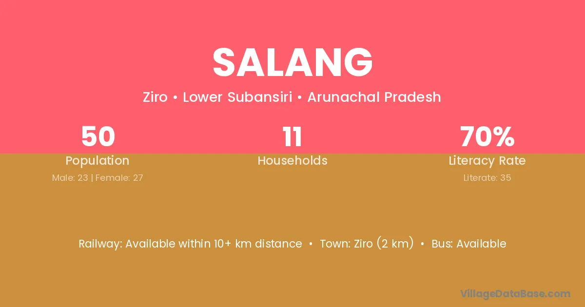 The literacy rate of Salang village is 69.44%. Male literacy stands at 83.91% and female literacy at 52.97%.