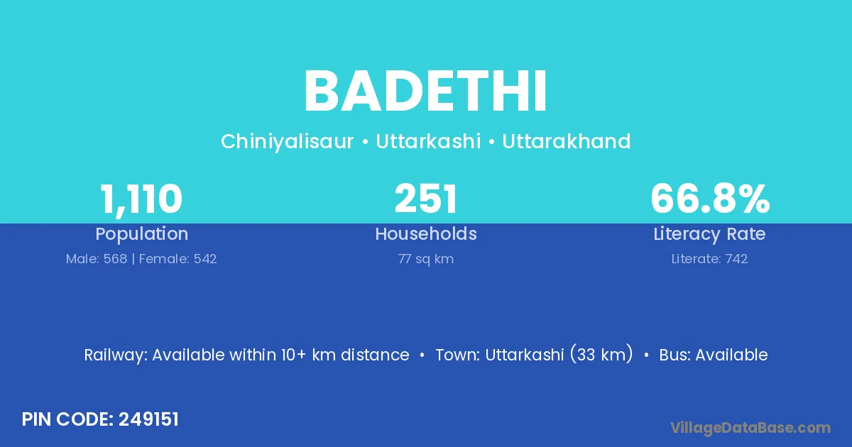 Uttarkashi (33 km) is the nearest town to Badethi village for major economic activities and is located approximately 33 km away.