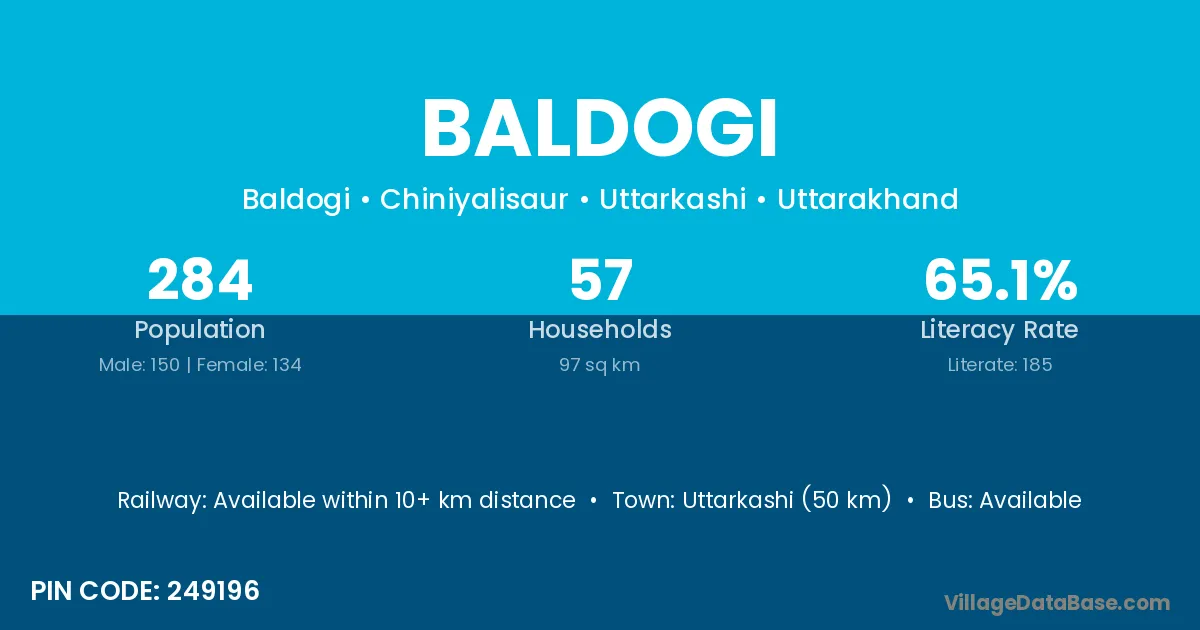 Uttarkashi (50 km) is the nearest town to Baldogi village for major economic activities and is located approximately 50 km away.