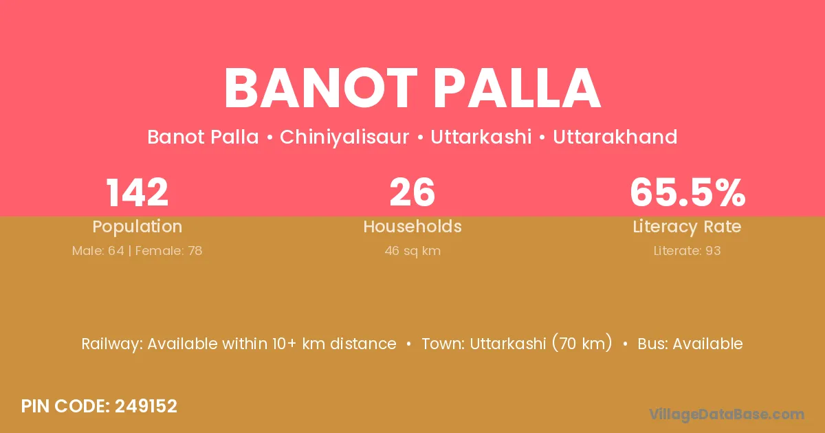 Uttarkashi (70 km) is the nearest town to Banot Palla village for major economic activities and is located approximately 70 km away.