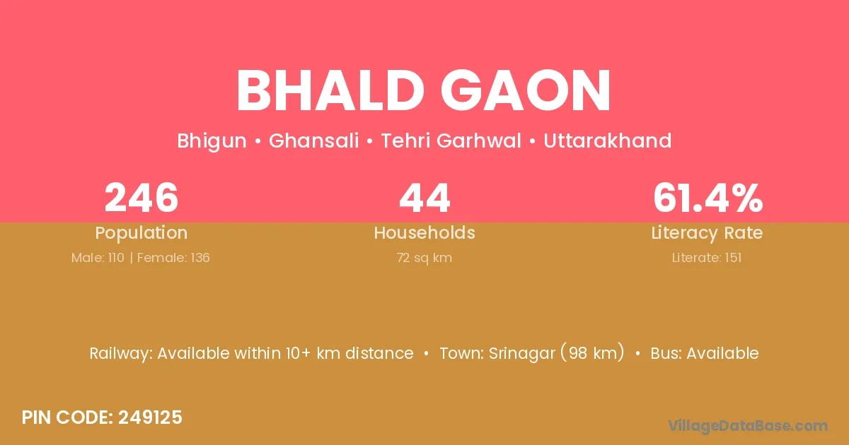 Uttarkashi (53 km) is the nearest town to Bhald Gaon village for major economic activities and is located approximately 53 km away.