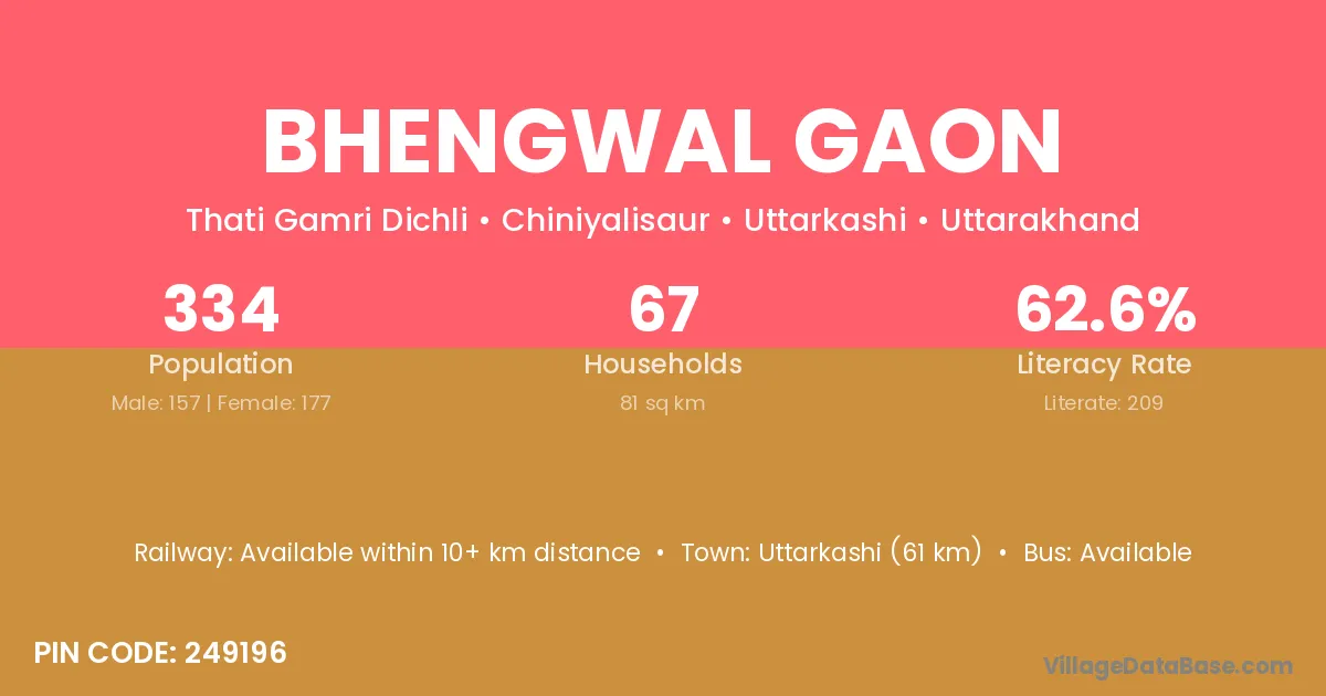 Uttarkashi (61 km) is the nearest town to Bhengwal Gaon village for major economic activities and is located approximately 61 km away.