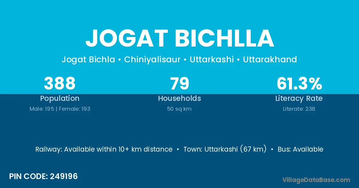 Uttarkashi (67 km) is the nearest town to Jogat Bichlla village for major economic activities and is located approximately 67 km away.