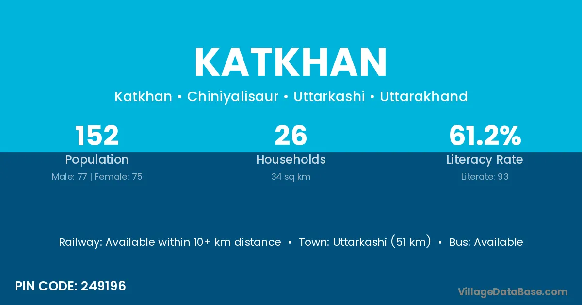 Uttarkashi (51 km) is the nearest town to Katkhan village for major economic activities and is located approximately 51 km away.