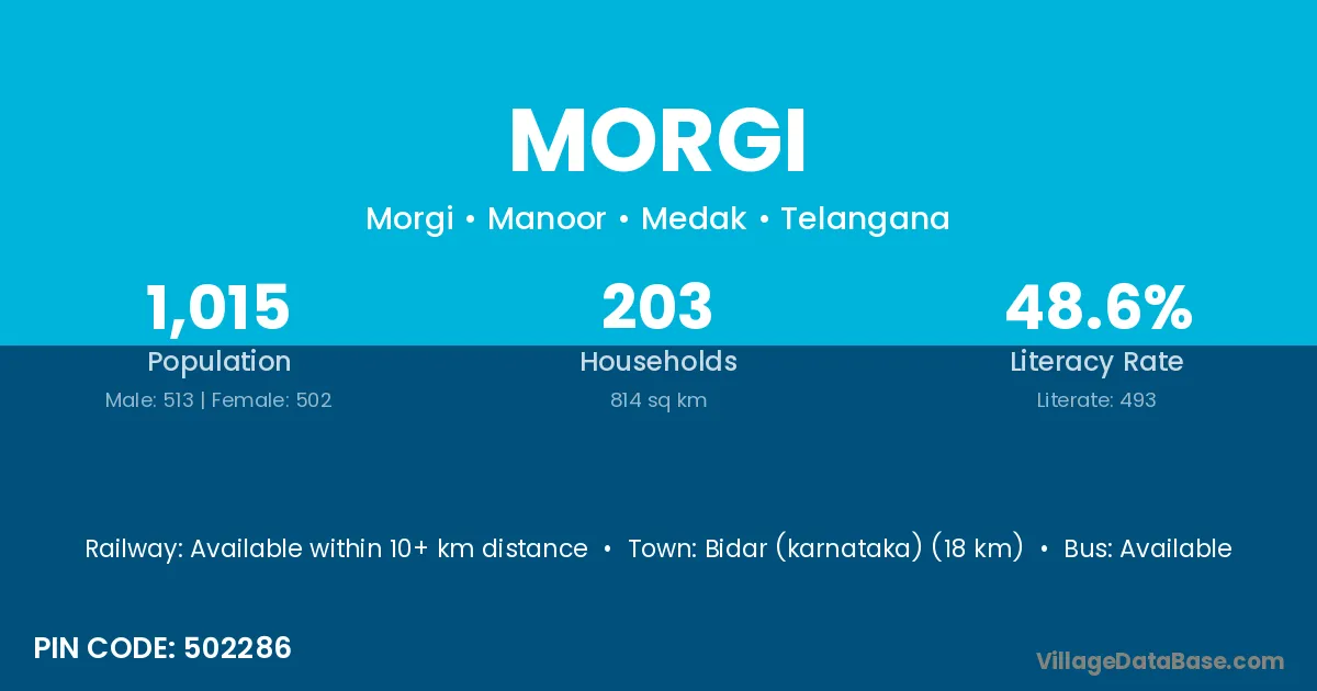 The literacy rate of Morgi village is 52.78%. Male literacy stands at 67.88% and female literacy at 40.59%.