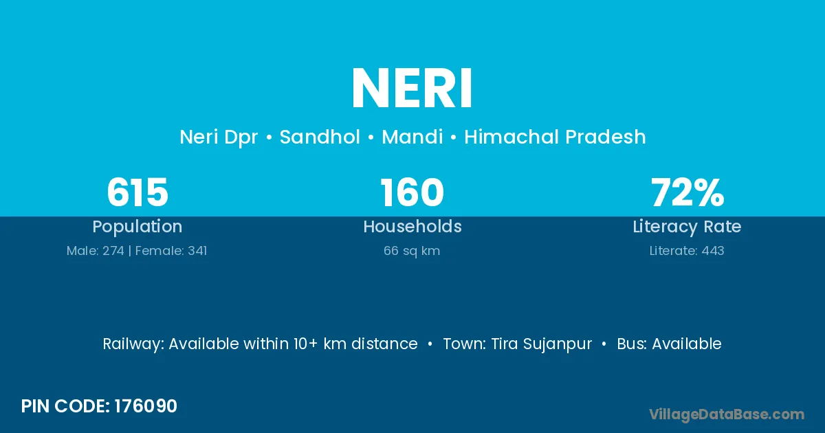 The literacy rate of Neri village is 66.33%. Male literacy stands at 73.66% and female literacy at 56.90%.