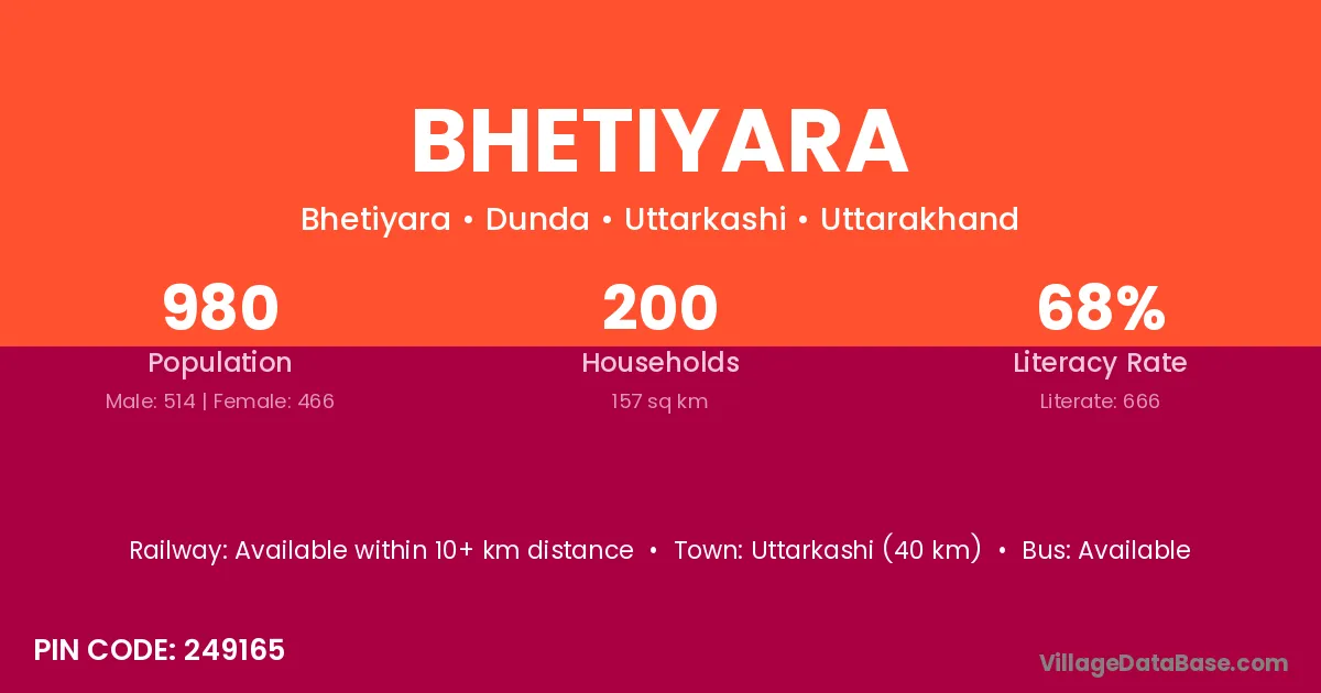 Uttarkashi (40 km) is the nearest town to Bhetiyara village for major economic activities and is located approximately 40 km away.