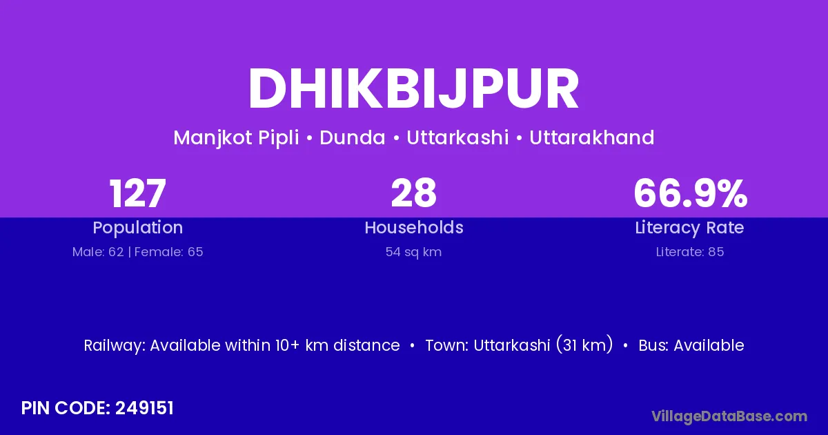 Uttarkashi (31 km) is the nearest town to Dhikbijpur village for major economic activities and is located approximately 31 km away.