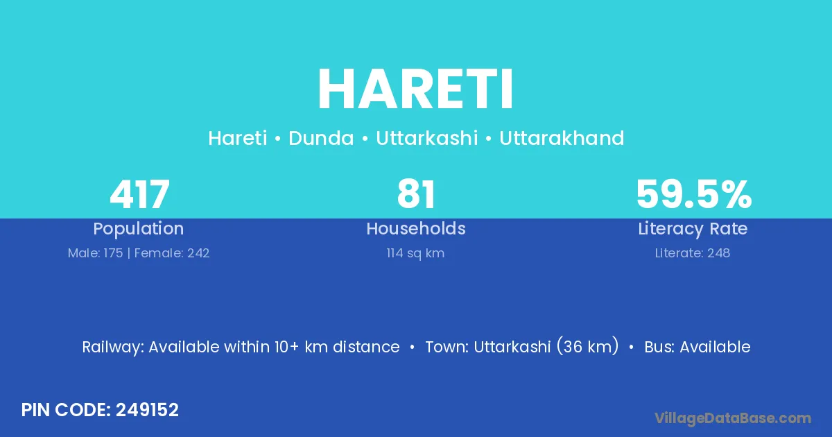Uttarkashi (36 km) is the nearest town to Hareti village for major economic activities and is located approximately 36 km away.