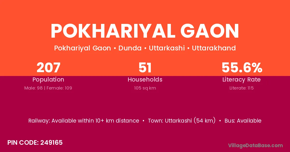 Pokhariyal Gaon village has a total population of 207 people, of which 98 are males and 109 are females.