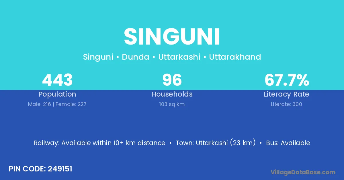 Uttarkashi (23 km) is the nearest town to Singuni village for major economic activities and is located approximately 23 km away.