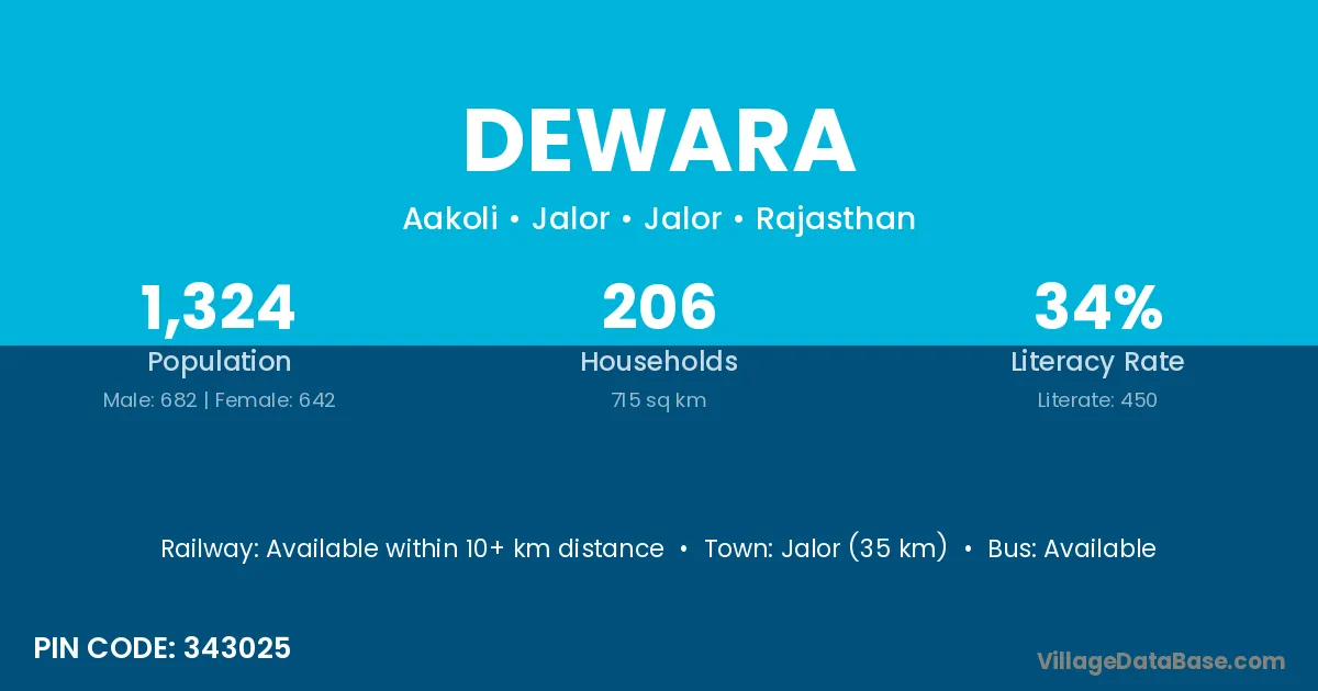 The literacy rate of Dewara village is 57.34%. Male literacy stands at 71.76% and female literacy at 43.61%.