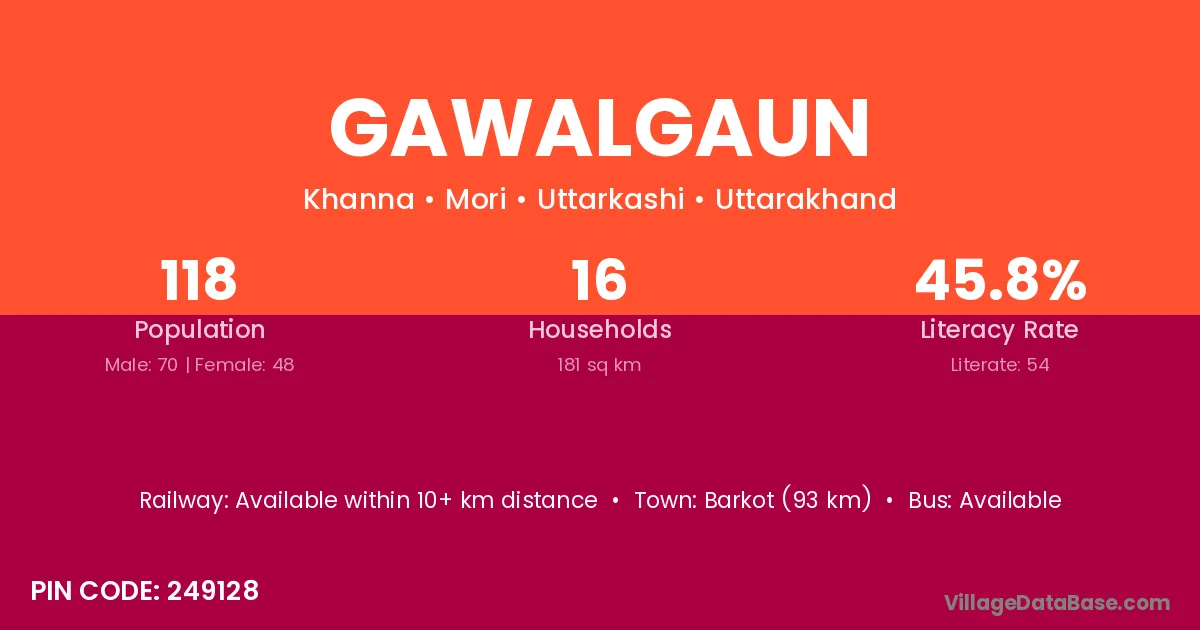 Barkot (93 km) is the nearest town to Gawalgaun village for major economic activities and is located approximately 93 km away.
