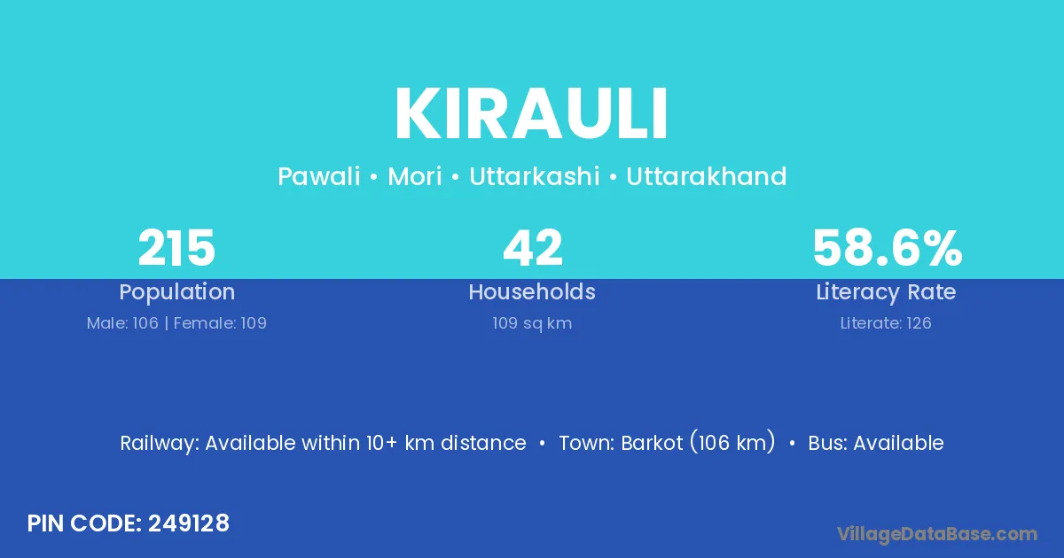 Barkot (106 km) is the nearest town to Kirauli village for major economic activities and is located approximately 106 km away.