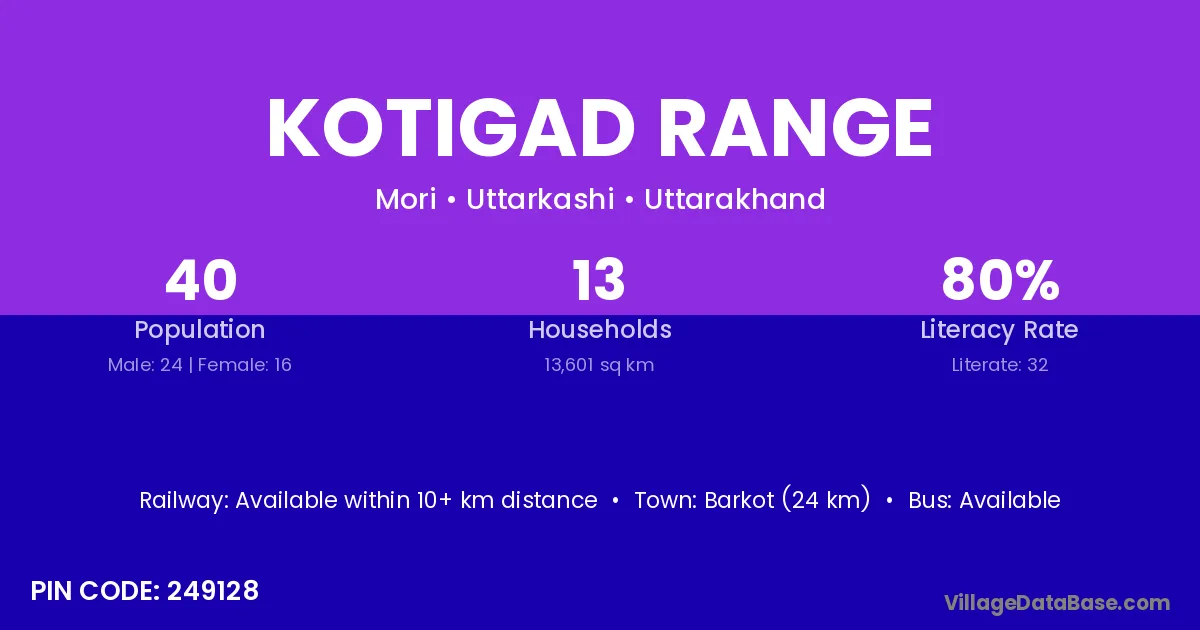Barkot (24 km) is the nearest town to Kotigad Range village for major economic activities and is located approximately 24 km away.