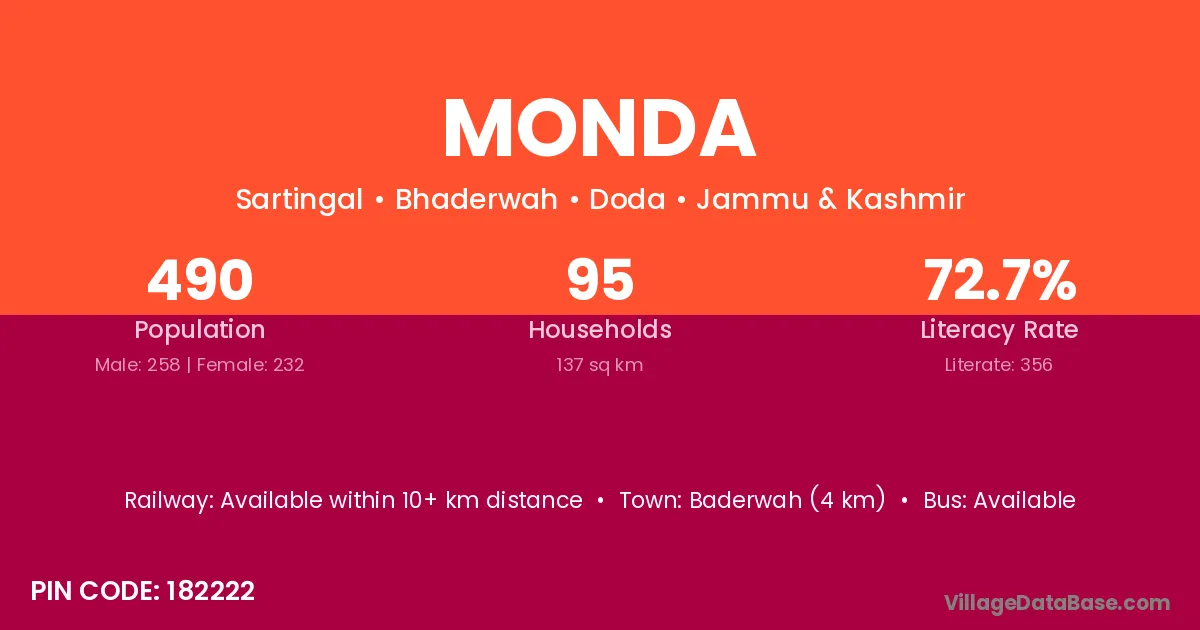 Rohadoo (55 km) is the nearest town to Monda village for major economic activities and is located approximately 55 km away.
