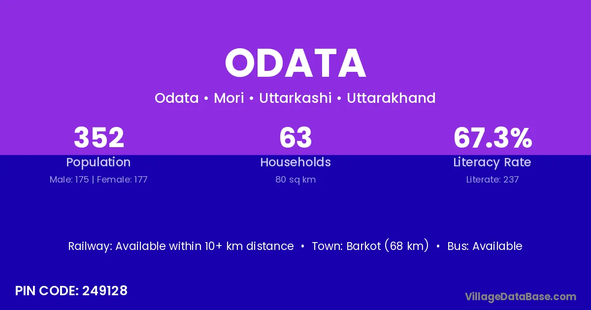 Barkot (68 km) is the nearest town to Odata village for major economic activities and is located approximately 68 km away.