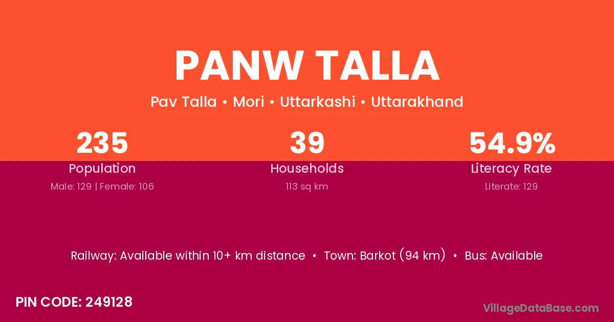 Barkot (94 km) is the nearest town to Panw Talla village for major economic activities and is located approximately 94 km away.