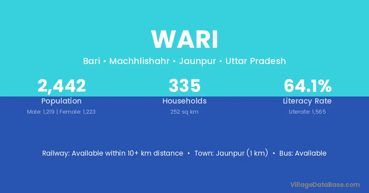 Wari village has a total population of 483 people, of which 244 are males and 239 are females.