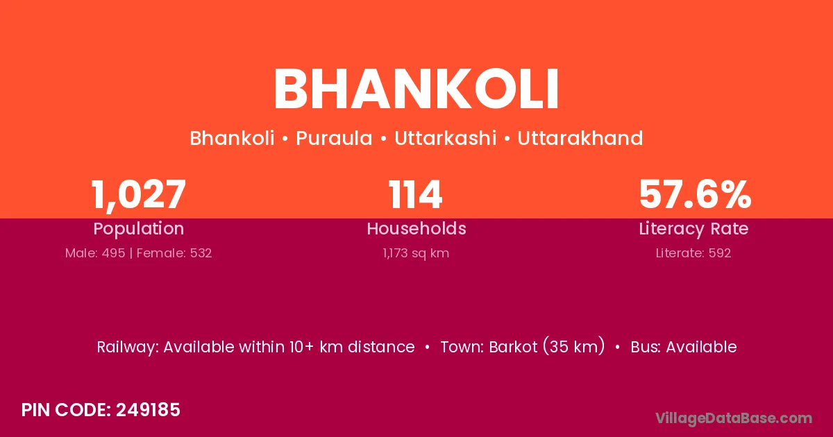 Barkot (35 km) is the nearest town to Bhankoli village for major economic activities and is located approximately 35 km away.
