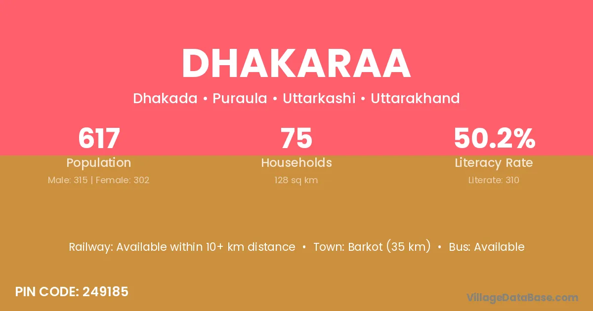 Barkot (35 km) is the nearest town to Dhakaraa village for major economic activities and is located approximately 35 km away.