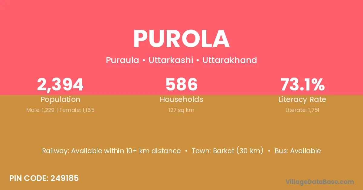 Barkot (30 km) is the nearest town to Purola village for major economic activities and is located approximately 30 km away.
