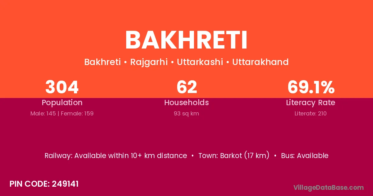Barkot (17 km) is the nearest town to Bakhreti village for major economic activities and is located approximately 17 km away.