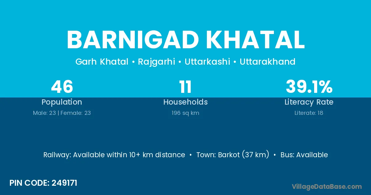 Barkot (37 km) is the nearest town to Barnigad Khatal village for major economic activities and is located approximately 37 km away.