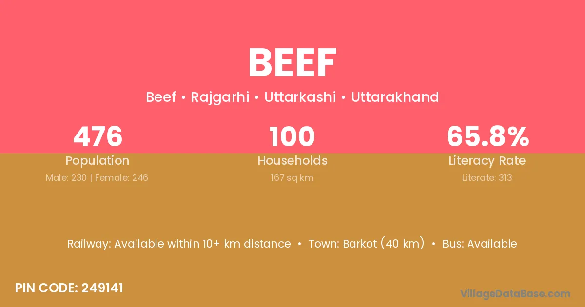 Barkot (40 km) is the nearest town to Beef village for major economic activities and is located approximately 40 km away.