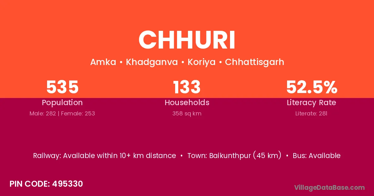 The literacy rate of Chhuri village is 63.25%. Male literacy stands at 75.41% and female literacy at 50.00%.