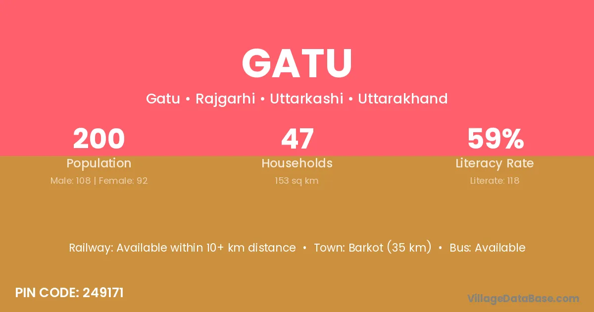 Barkot (35 km) is the nearest town to Gatu village for major economic activities and is located approximately 35 km away.