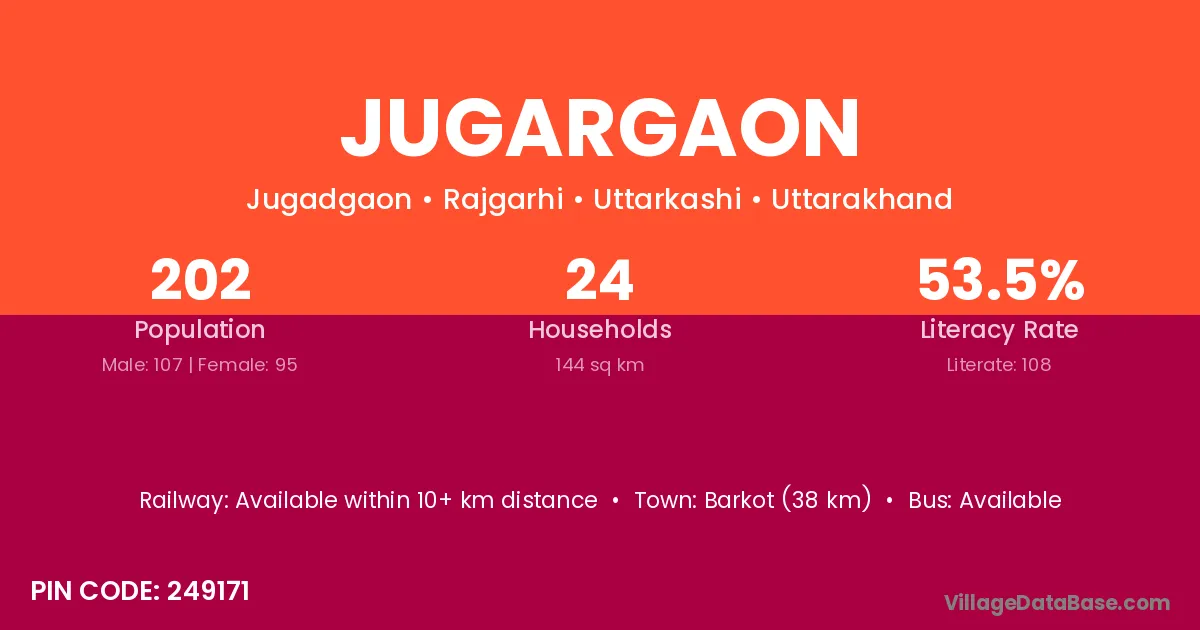 Barkot (38 km) is the nearest town to Jugargaon village for major economic activities and is located approximately 38 km away.