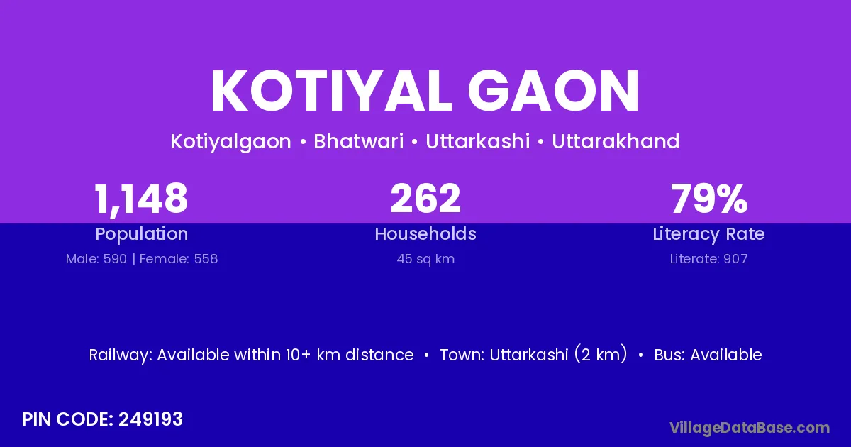 Barkot (15 km) is the nearest town to Kotiyal Gaon village for major economic activities and is located approximately 15 km away.