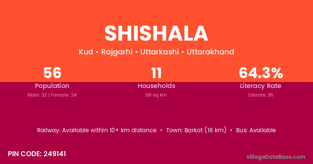 Barkot (16 km) is the nearest town to Shishala village for major economic activities and is located approximately 16 km away.