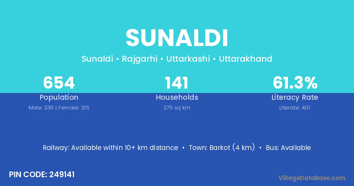 Barkot (4 km) is the nearest town to Sunaldi village for major economic activities and is located approximately 4 km away.