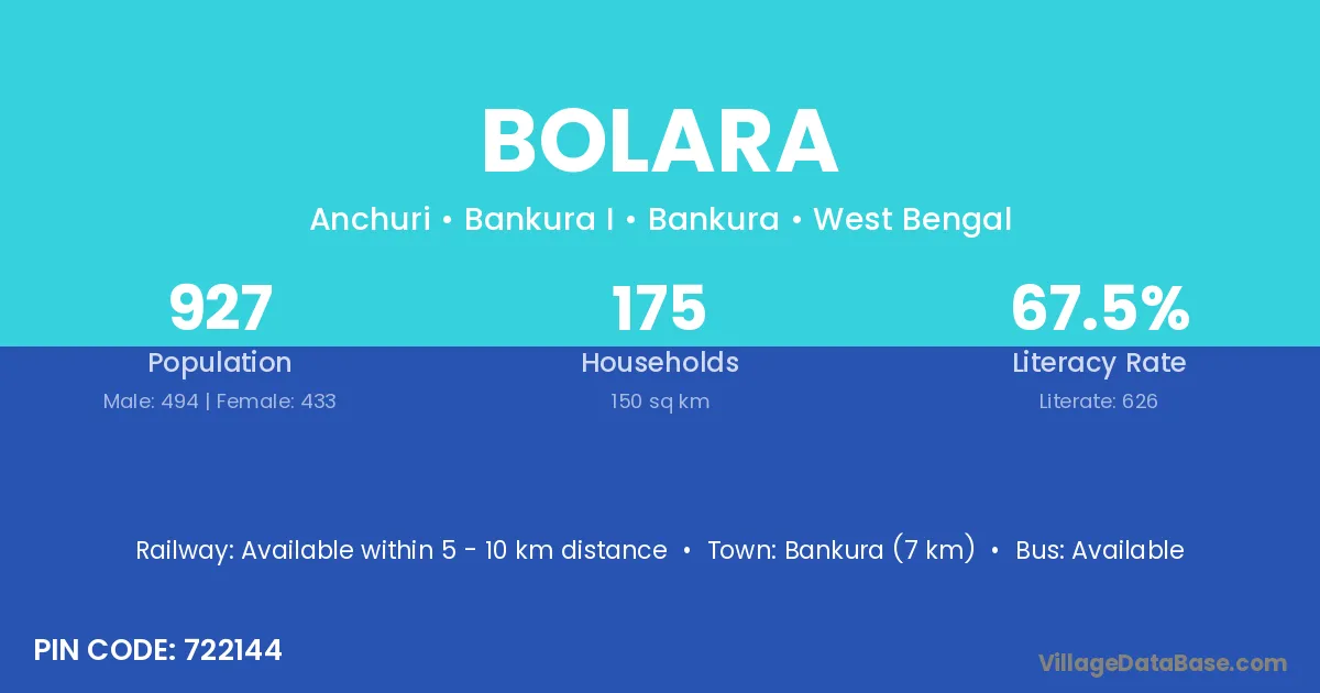 Bankura (7 km) is the nearest town to Bolara village for major economic activities and is located approximately 7 km away.