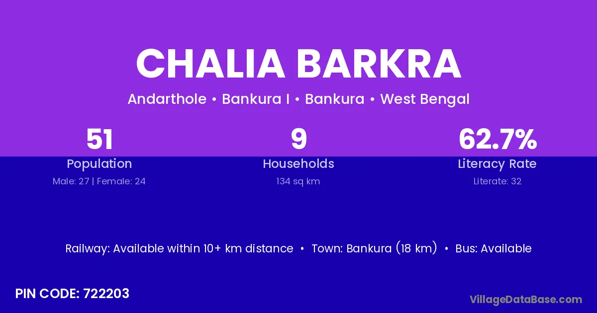 Bankura (18 km) is the nearest town to Chalia Barkra village for major economic activities and is located approximately 18 km away.