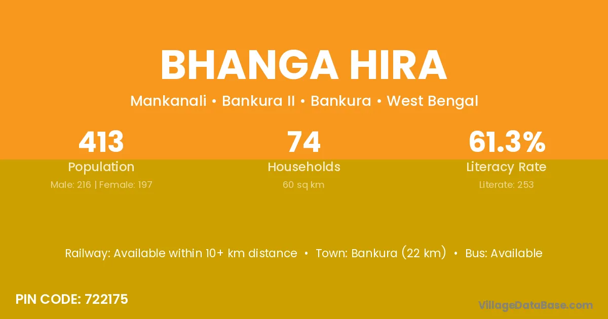 Bankura (22 km) is the nearest town to Bhanga Hira village for major economic activities and is located approximately 22 km away.